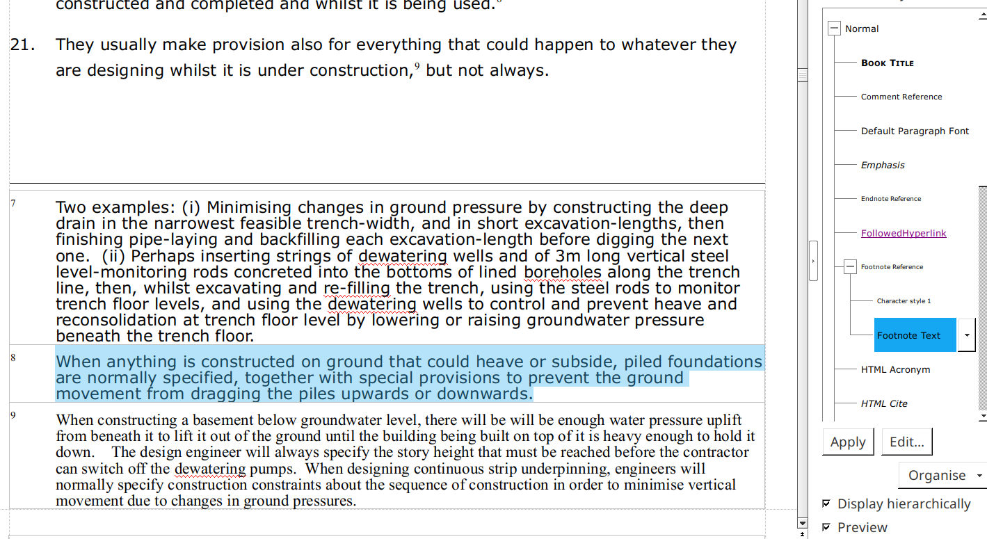 2. Footnote 7 contains hard formatted text (probably to compensate for #1), applying a new paragraph style should not remove the formatting.