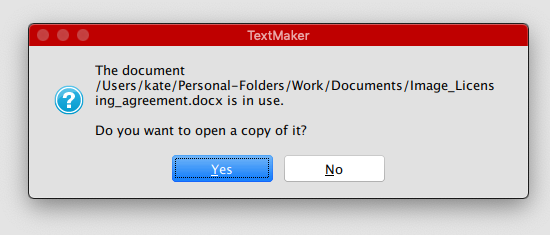 After installing Softmaker on my mac (OS10.14.6) I find that every file I open prompts a message stating that the file is in use, or is write protected - do I want to open a copy of it?
