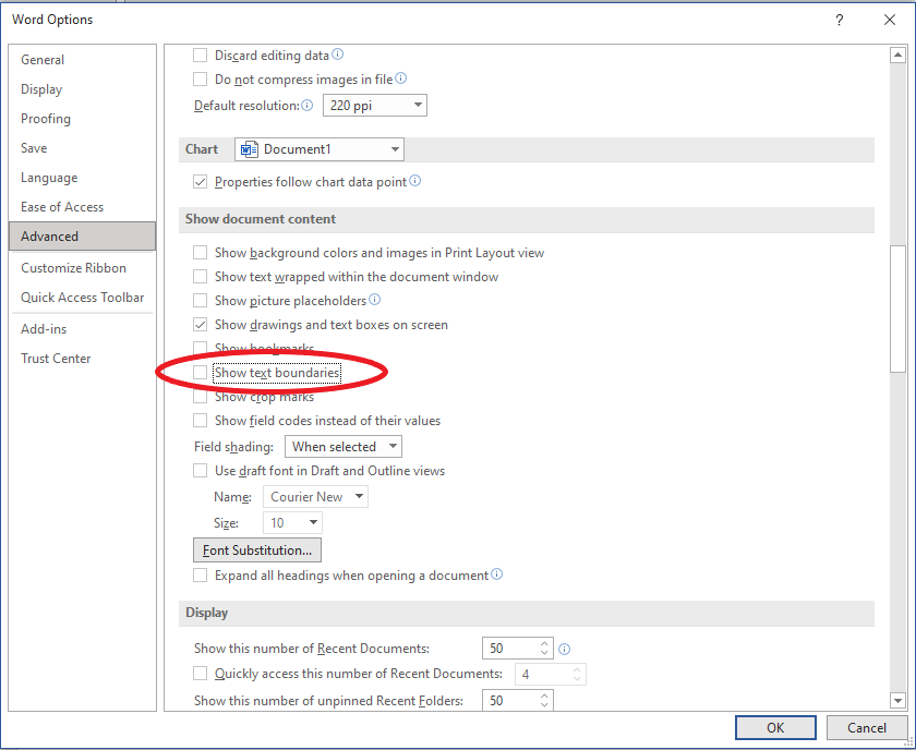 In MS-Word, you can check this by clicking on File> Options > Advanced > "Show document content" > "Show text boundaries" as shown in the screenshot below: