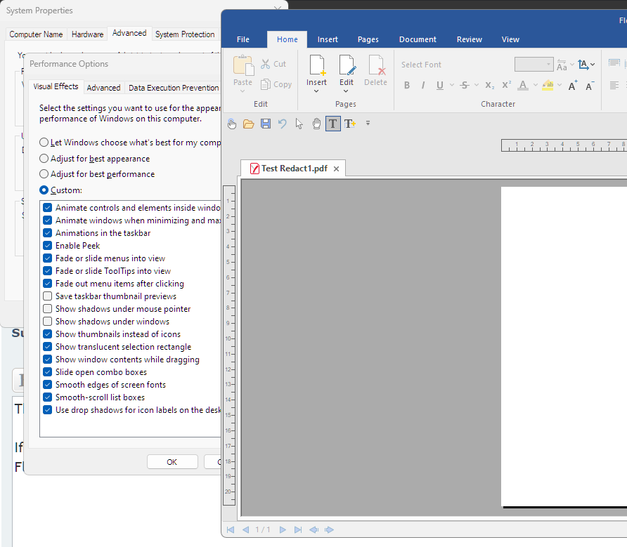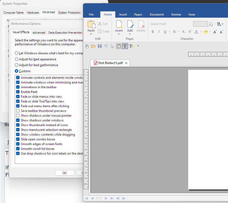 Attached is a screen shot of the System Properties / Performance Options in my computer (Windows 10), where you can see that option "Show shadows under windows" is in fact disabled. But even so, I continue to get the shadow around the PDF2025 border.