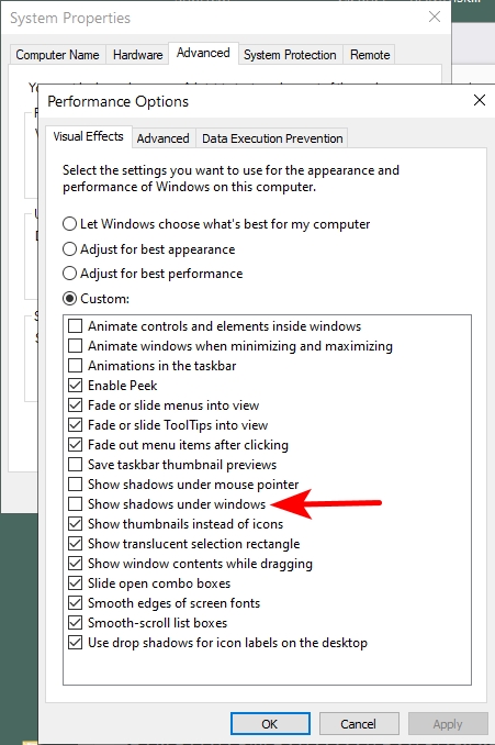 My computer runs on Windows 10 Professional with all the latest updates. In my Windows 10, the option "Show shadows under windows", in the System Properties, is already disabled, but I get the shadow around PDF2025 anyway.