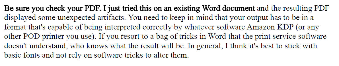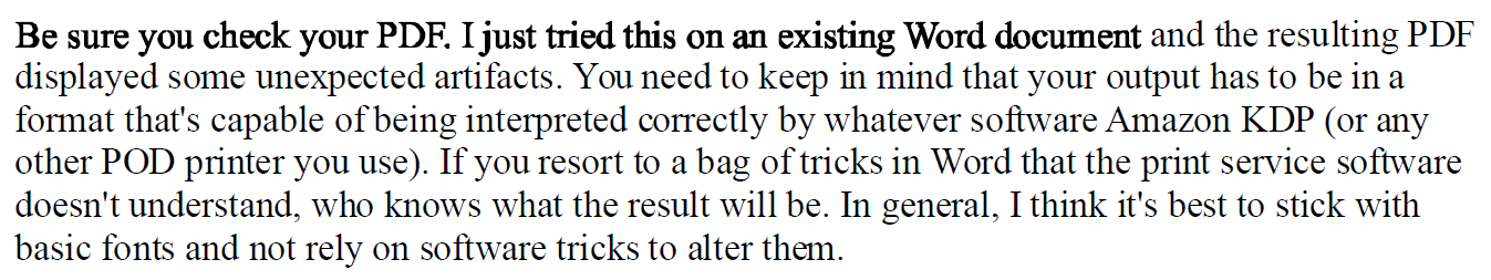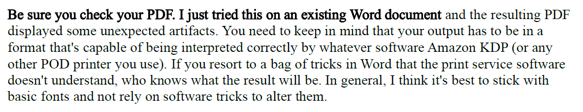 Of course it's a bad idea, but it wasn't my idea. I didn't even know that Word offered that "feature" until I read this gentleman's post. I tried it for the sole reason of seeing what the result would be. What I did NOT expect was the FlexiPDF would generate a result so much worse than another virtual printer.martin-k wrote: Fri Dec 06, 2024 8:19 pm Using a stroke to make a font bolder is a horrible idea, typographically speaking.