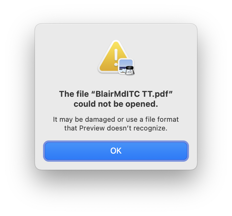I am unable to open a PDF when the Blair font is used. Attached are the error messages I get when I try to export to PDF. I get Error code 58