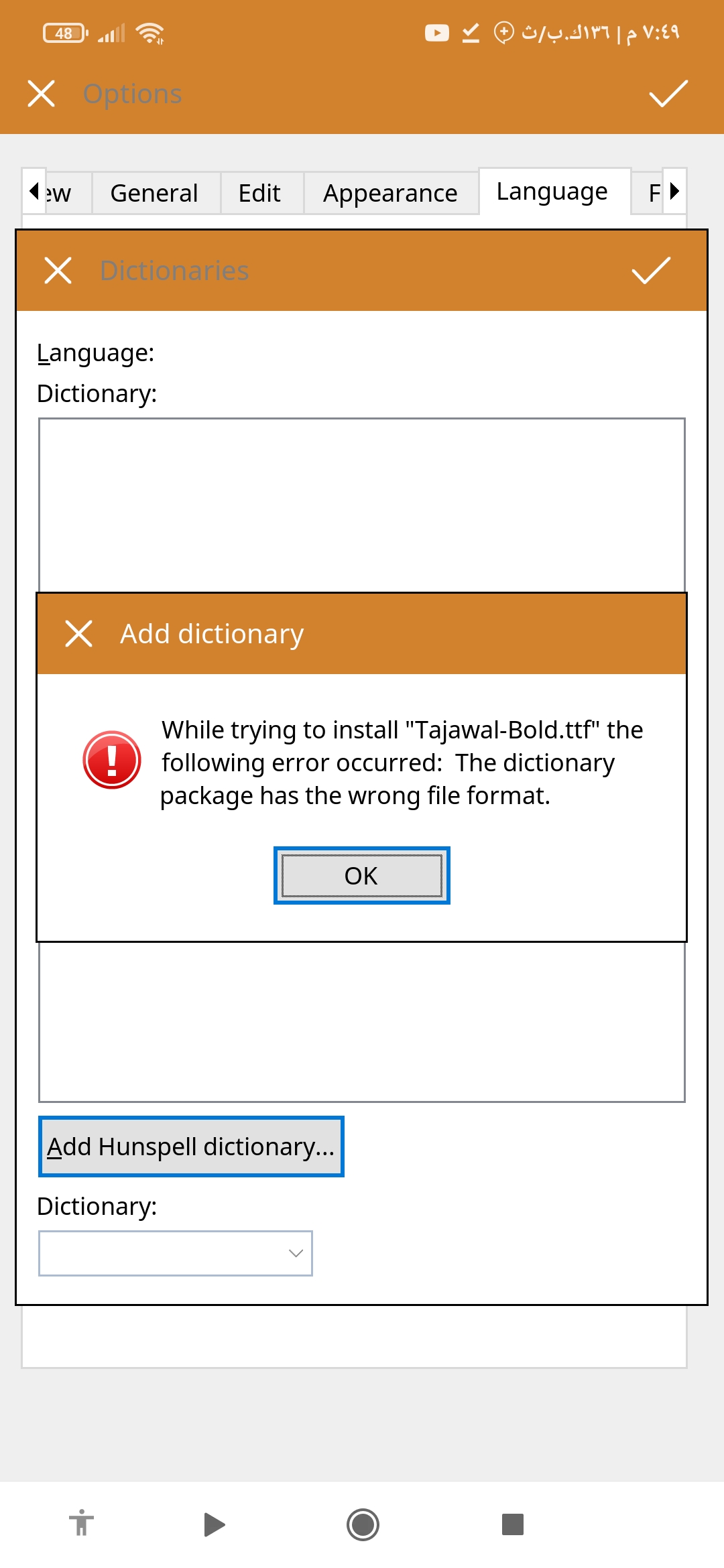 Thanks for trying the step, but this third step is also important. If you already have any Arabic font in your device, select it or install one new so that you will be able to type in Arabic.SuperTech wrote: Thu Feb 10, 2022 10:02 pm 3. Please select the appropriate font which supports Arabic language. If there is none, then please download and install one. After selecting Arabic supported font, you will be able to type.