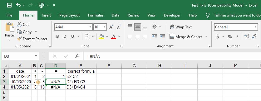 2. I've tried WPS Office, Apache OpenOffice, Corel Quattro Pro (trial), MS Excel 2007, MS Excel Online, Google Tables etc. Most of the programs have shown different errors in the formula. Our Russian programmers IMO won this contest for incompatibility with LibreOffice: in MyOffice, '=D2+B3-C3' became a monstrous '=A1048576+XFC1-XFD1'. The only office app that worked fine was, curiously, OnlyOffice.