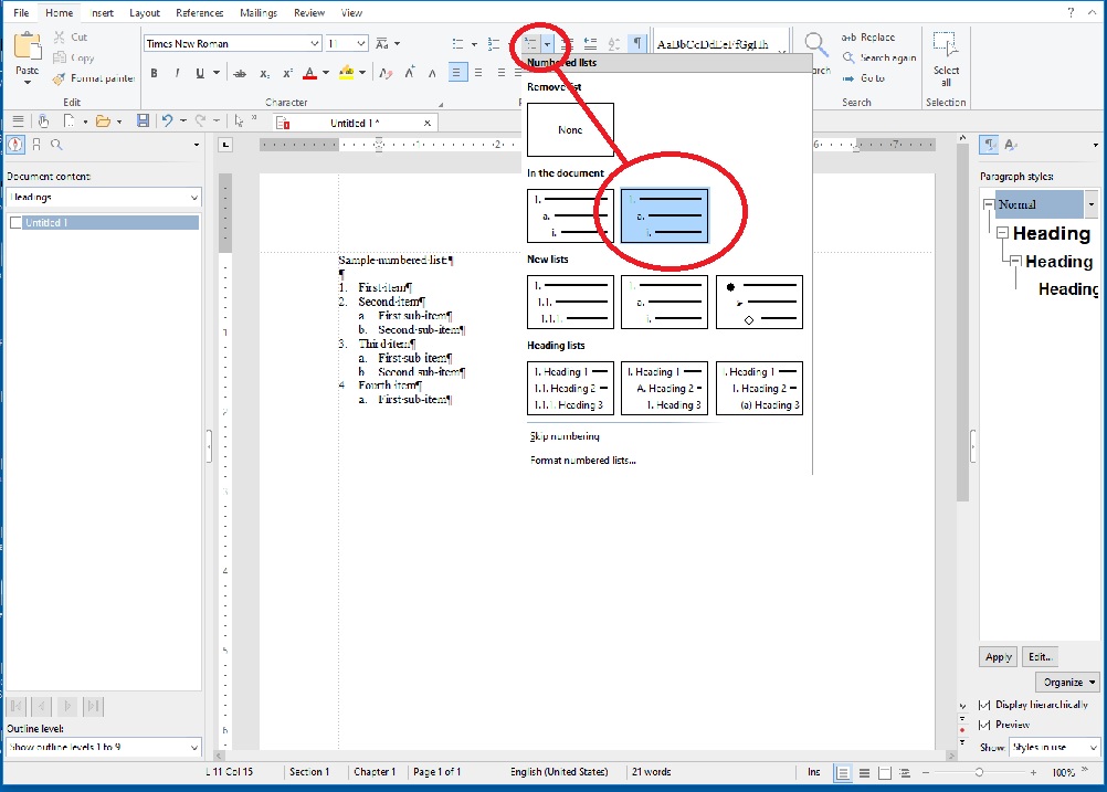 Clicking the small arrow next to this icon will open a drop-down window from which you can select the style of the numbered list you want. The second option on the top row matches your outline organization.